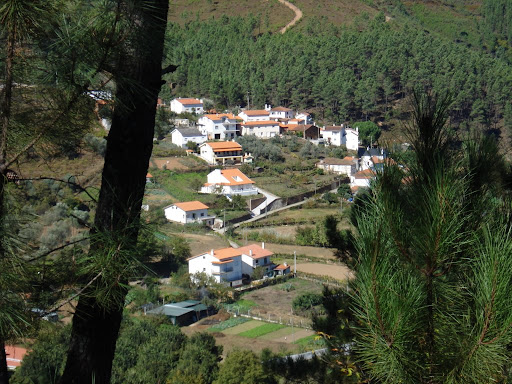 Núcleo central d' O Povo, o bairro principal de Pomares, visto por entre pinheiros.