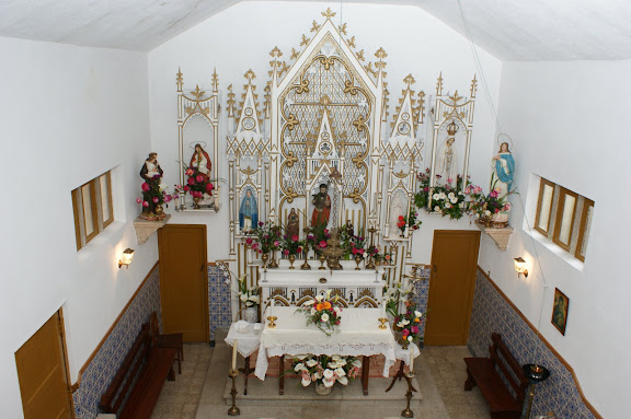Capela da Sorgaçosa. Pormenor do altar em madeira trabalhado em filigrana de estilo gótico, cuja autoria se atribui a seu tio o Cónego Nogueira na altura pároco do Piódão.