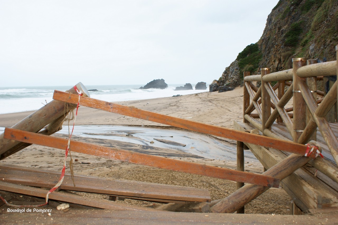 Praia da Adraga...nem o gradeamento de madeira tratada e a escadaria para a areia escaparam às investidas das ondas...